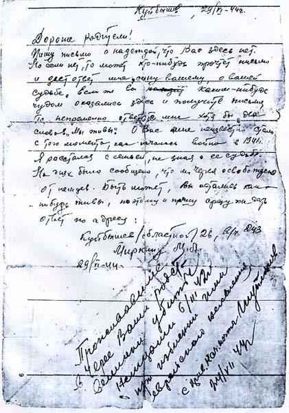 «Дорогие родители! Пишу письмо с надеждой, что Вас здесь нет. (Мота Миркин надеялся, что родители успели эвакуироваться на восток, он уже слышал о зверствах фашистов, о расправах с еврейским населением – А. Ф.). Но если нет, то может кто-нибудь прочтет письмо и даст ответ мне, сыну Вашему, о Вашей судьбе. Если же Вы каким-нибудь чудом уже оказались здесь и получили письмо, то непременно ответьте мне, хотя бы два слова: «Мы живы». О Вас мне неизвестно стало с той минуты, когда началась война в 1941 году. Я расстался с семьей, не зная о ее судьбе. Но уже было сообщение, что м. Черея освобождено от немцев. Быть может, Вы остались как-нибудь живы, поэтому прошу сразу же дать ответ. Миркин М.Л.»