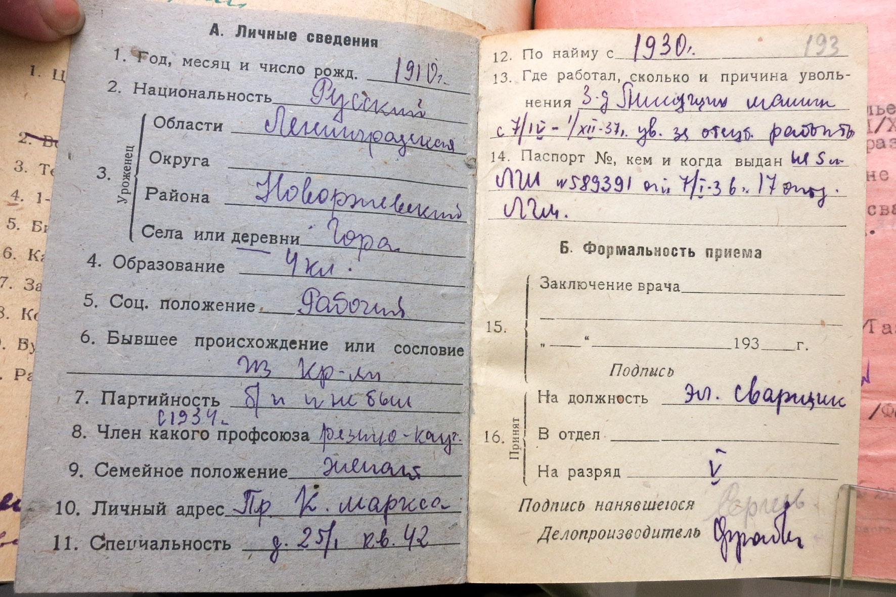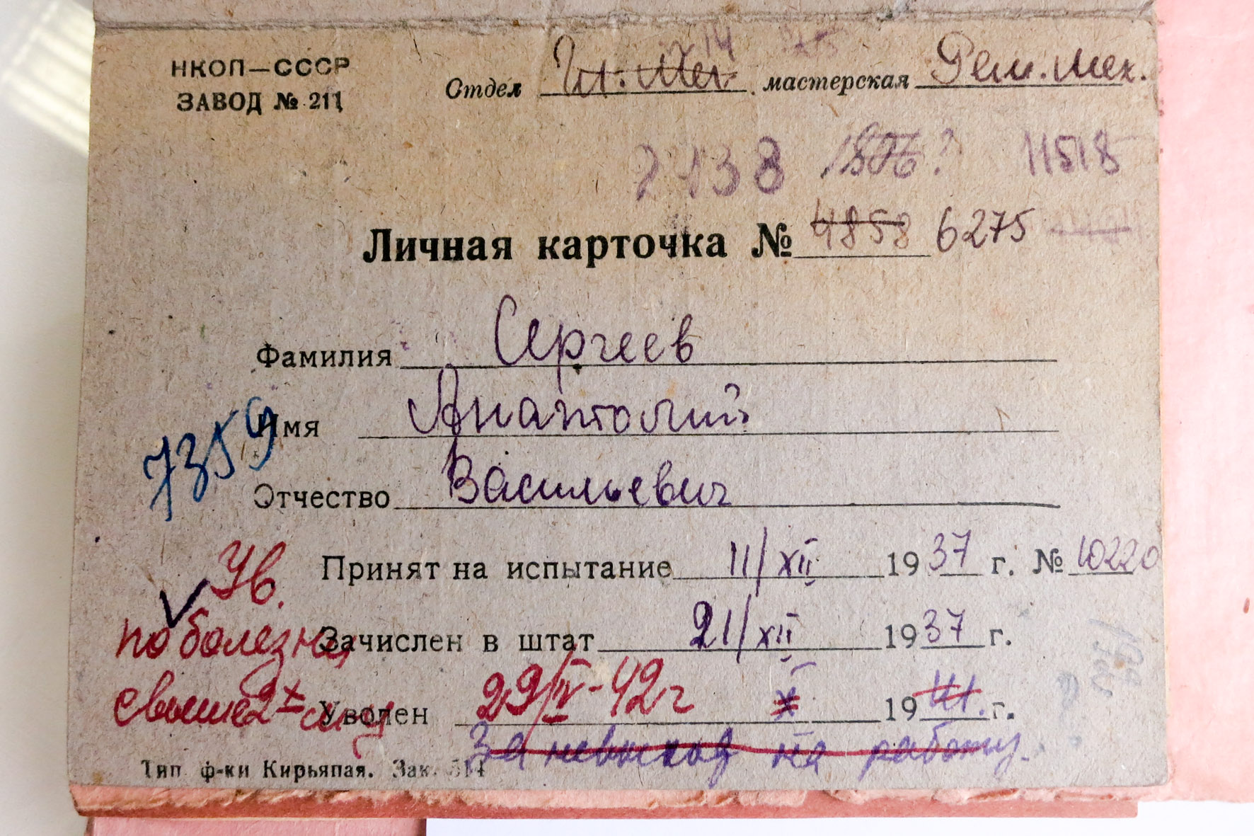 Представлены: Личная карточка об увольнении Сергеева А.С. по болезни в 1942 году; Трудовая книжка Сергеева А.С.; Справка о работе на заводе Почтовый ящик № 729 с 1937 по 1942 г.; Служебная записка о снятии с учета работника Сергеева из-за длительной болезни в 1942 году.