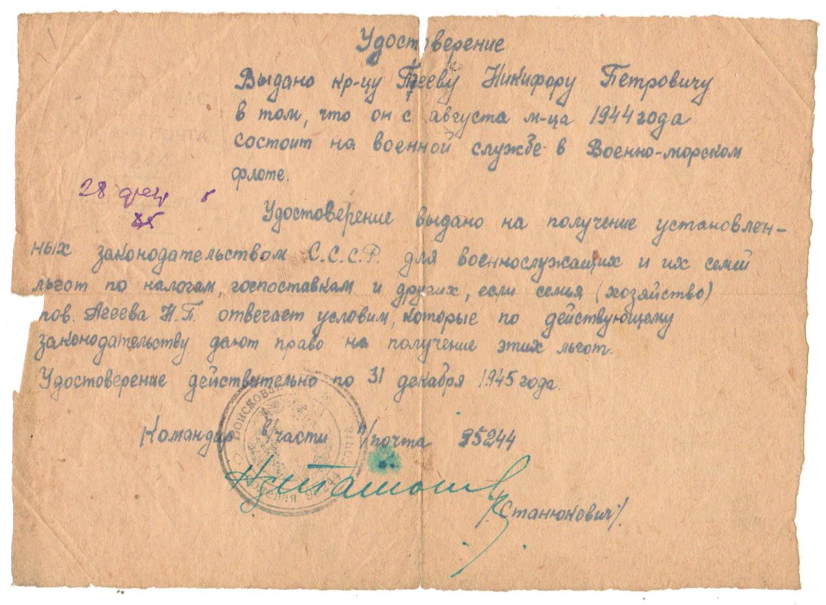 Сохранилось удостоверение, выданное красноармейцу Н.П.Агееву. В нём говорится о том, что он с августа 1944 года состоял на службе в Военно-морском флоте (данное удостоверение выдано его семье на получение установленных законодательством льгот).