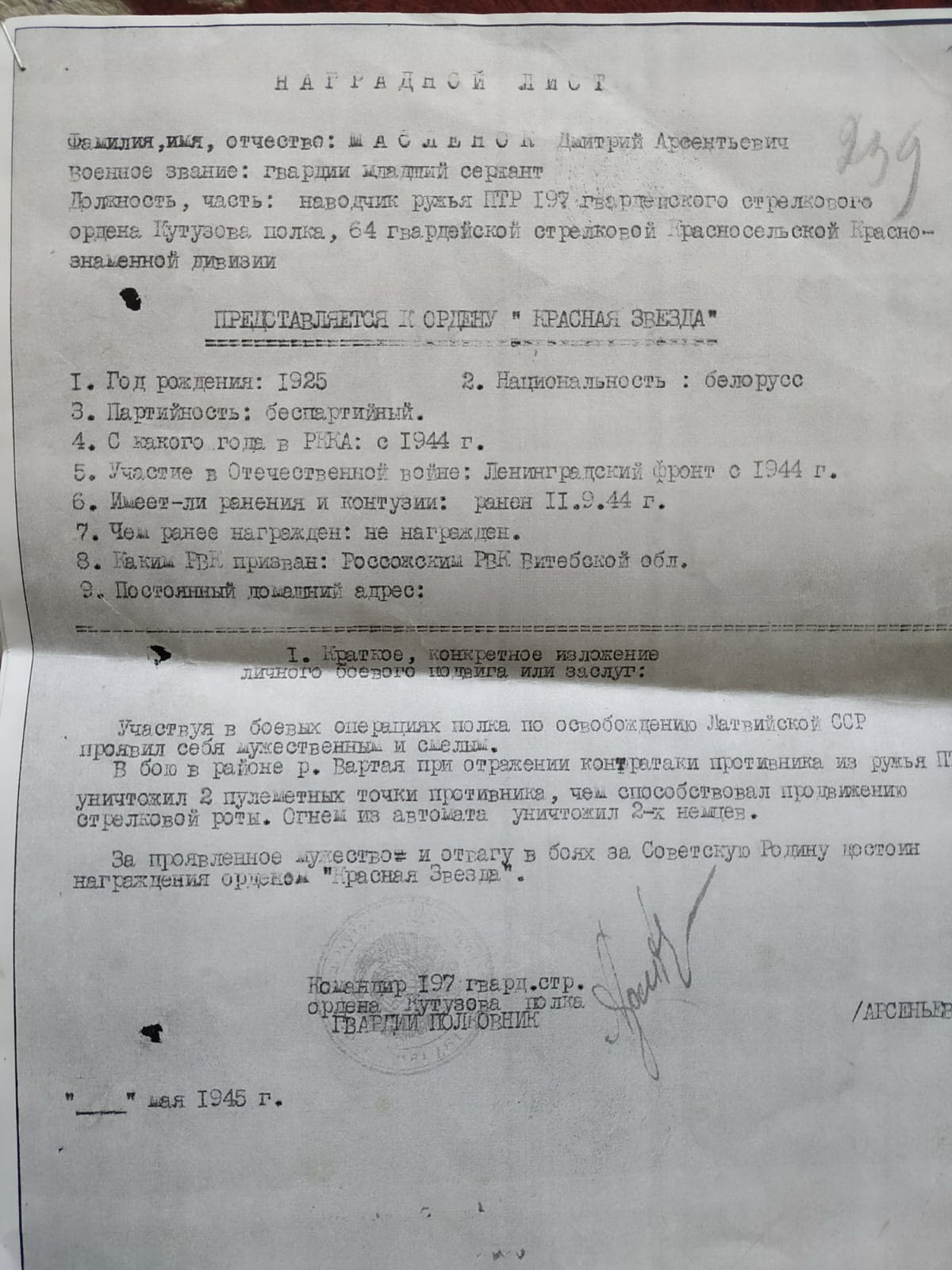 Материал предоставлен директором государственного учреждения культуры «Витебская районная централизованная библиотечная система» Республики Беларусь Нисневич Галиной Дмитриевной – дочерью Дмитрия Арсентьевича Маслёнка.