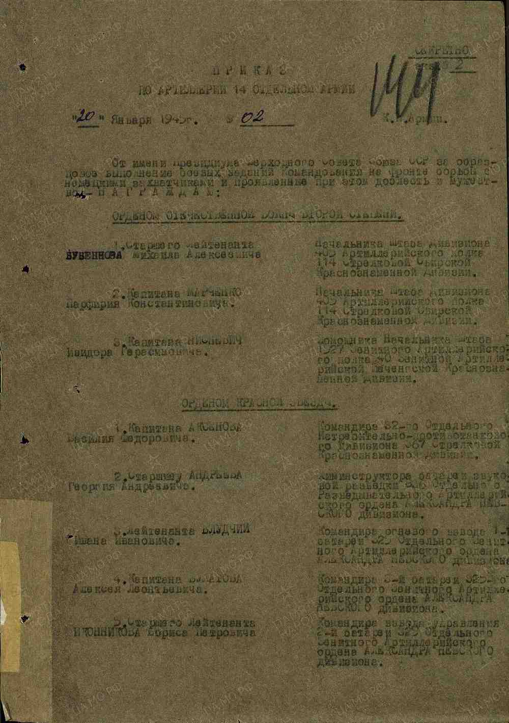 - приказ по артиллерии 14 отдельной армии о награждении Орденом Отечественной войны II степени.