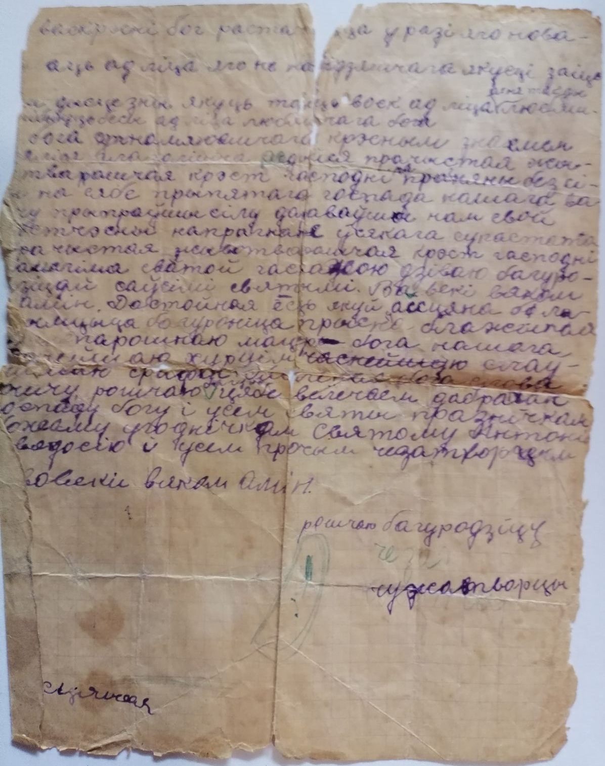 Войну мой дедушка, Баранов Алексей Андреевич, встретил молодым младшим лейтенантом, он служил на западе Белоруссии. С первых дней войны он оказался на фронте. Бабушка дала ему святое письмо. Всю войну с ним было письмо, переданное бабушкой. Он рассказывал, что после наступления вся шинель прострелена, а сам цел и верил, что это оно его бережет. Это письмо и сейчас хранится у нас в семье. Дедушка рассказывал о войне не много, или это мы тогда были детьми и не всегда хотели его слушать. Он рассказывал об атаках, когда бежишь и стреляют со всех сторон, впереди немцы, сзади свои и очень повезет, если останешься жив.