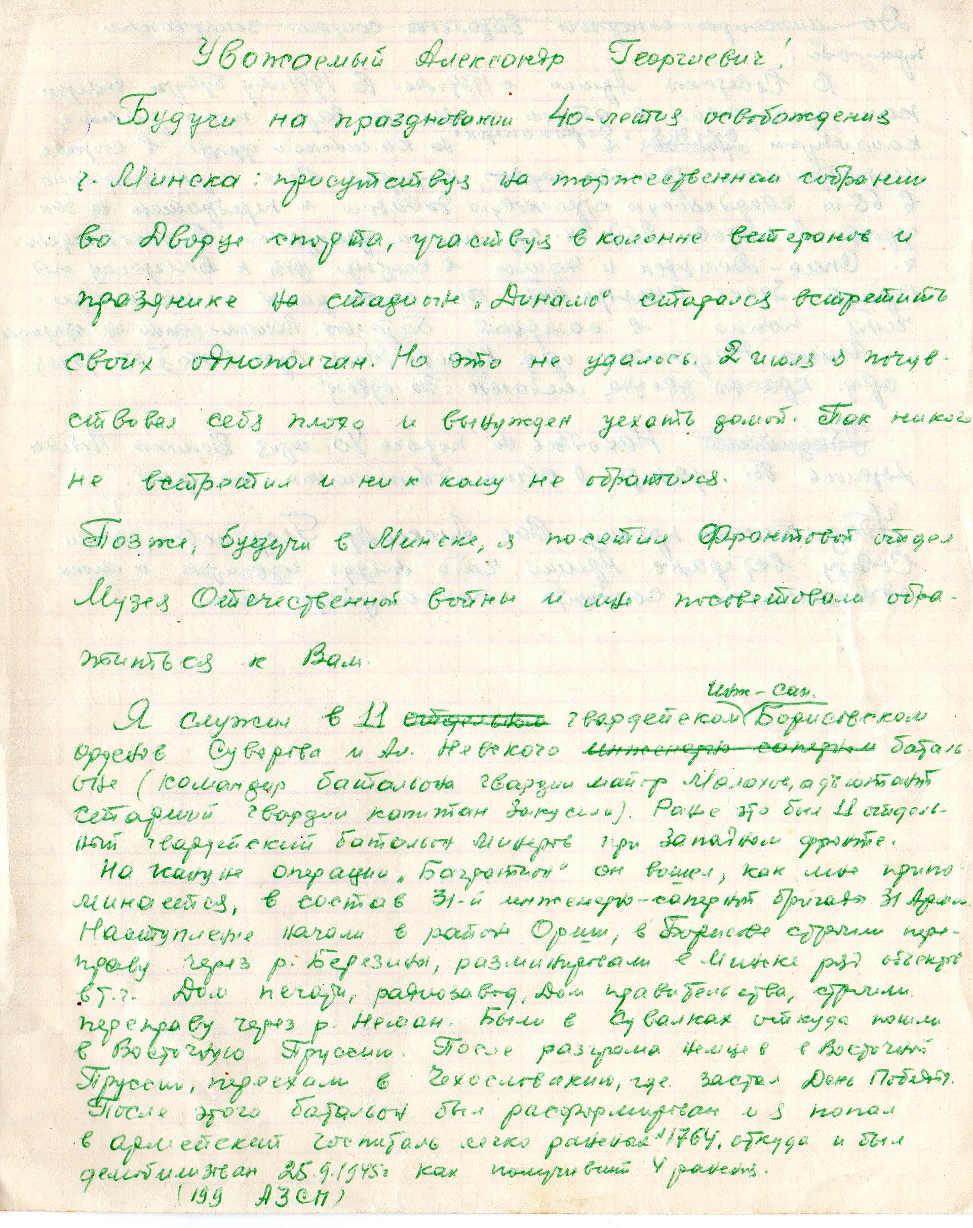 Будучи на праздновании 40-летия освобождения г. Минска: присутствуя на торжественном собрании во Дворце спорта, участвуя в колонне ветеранов и празднике на стадионе «Динамо» старался встретить своих однополчан. Но это не удалось. 2 июля я почувствовал себя плохо и вынужден уехать домой. Так никого не встретил и ни к кому не обратился.