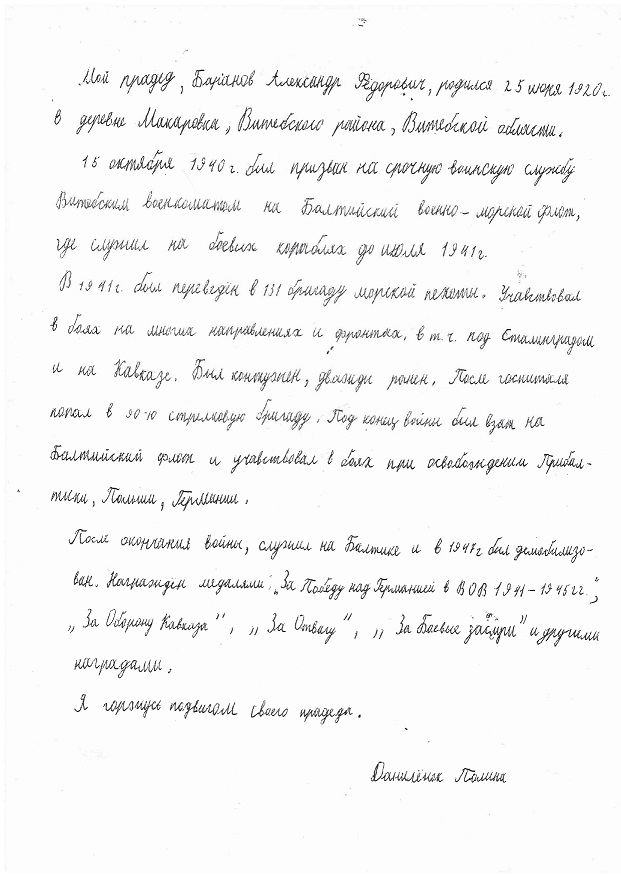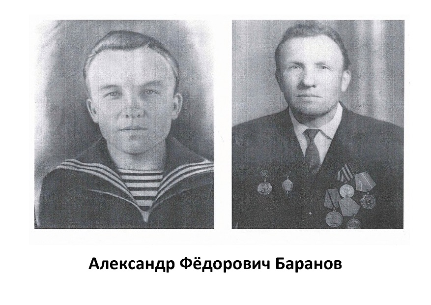 Мой прадед, Баранов Александр Федорович, родился 25 июня 1920 года в деревне Макаровка Витебского района Витебской области. 15 октября 1940 года был призван на срочную воинскую службу Витебским военкоматом на Балтийский военно-морской флот, где служил на боевых кораблях до июля 1941 г.