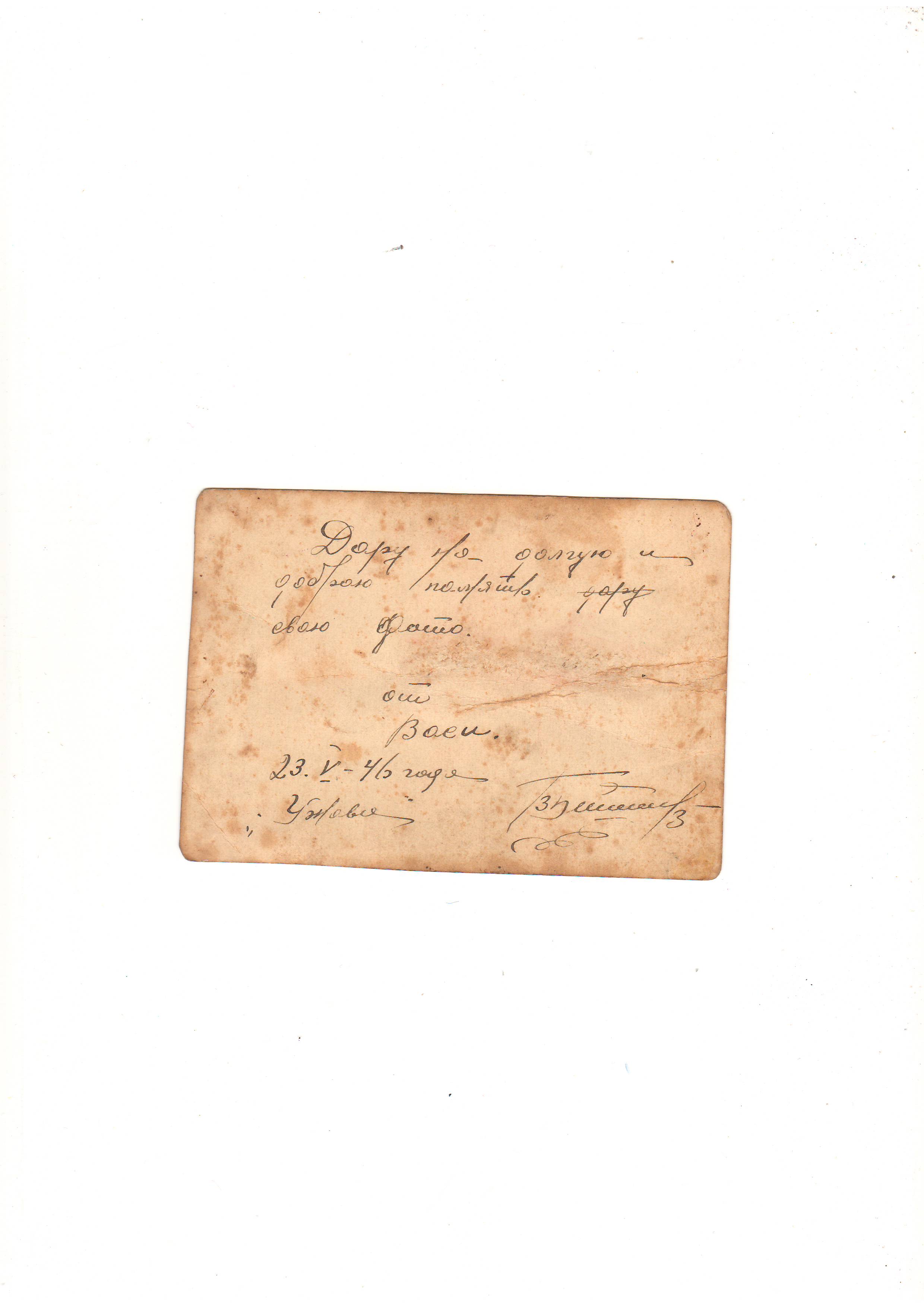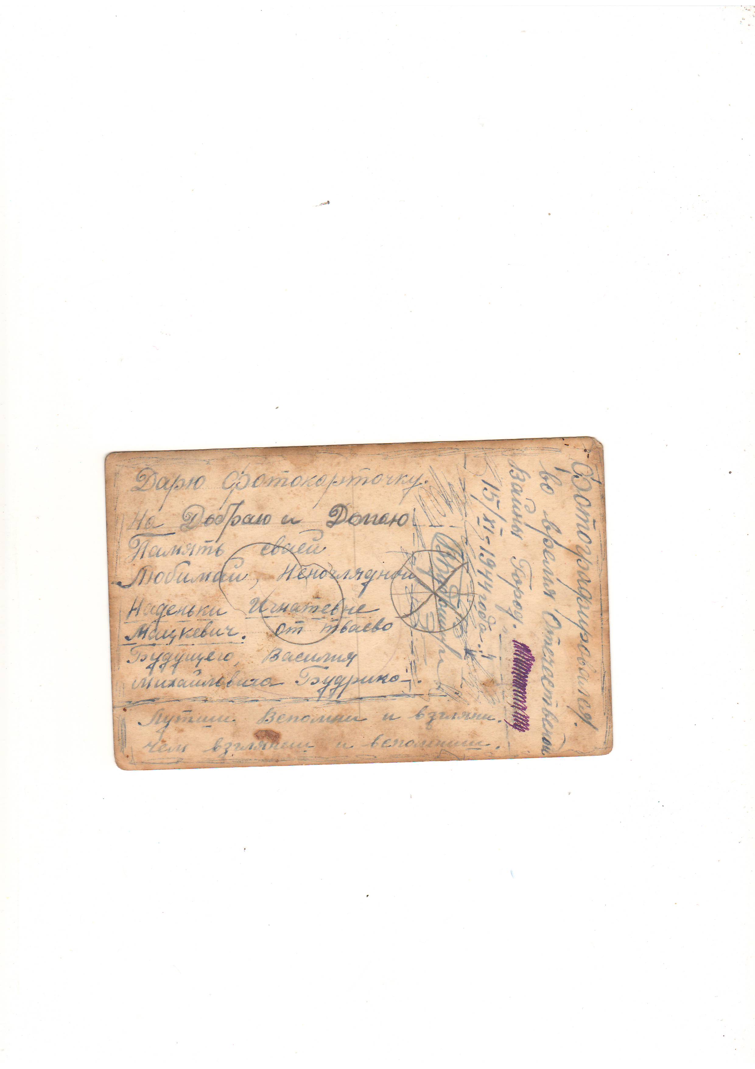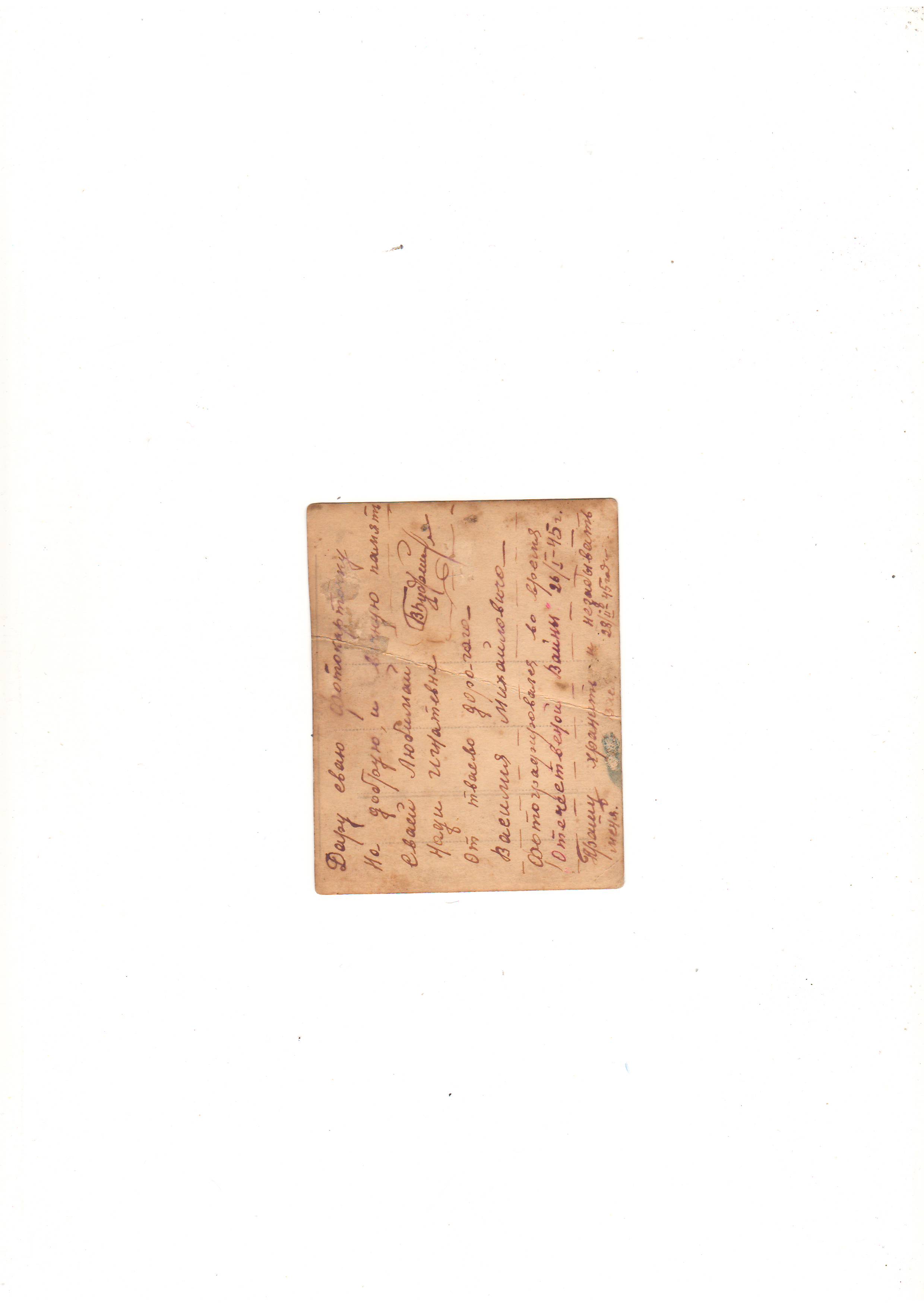 Надписи на обороте фотографии 3: "Дарю свою фотокарточку на добрую и вечную память своей любимой Наде Игнатьевне от твоего дорогого Василия Михайловича. Фотографировался во время Отечественной войны. 26 января 1945 г.» Приписка: «Прошу хранить и не забывать. 28 февраля 1945 г.»
