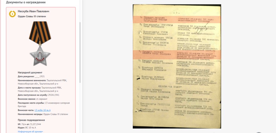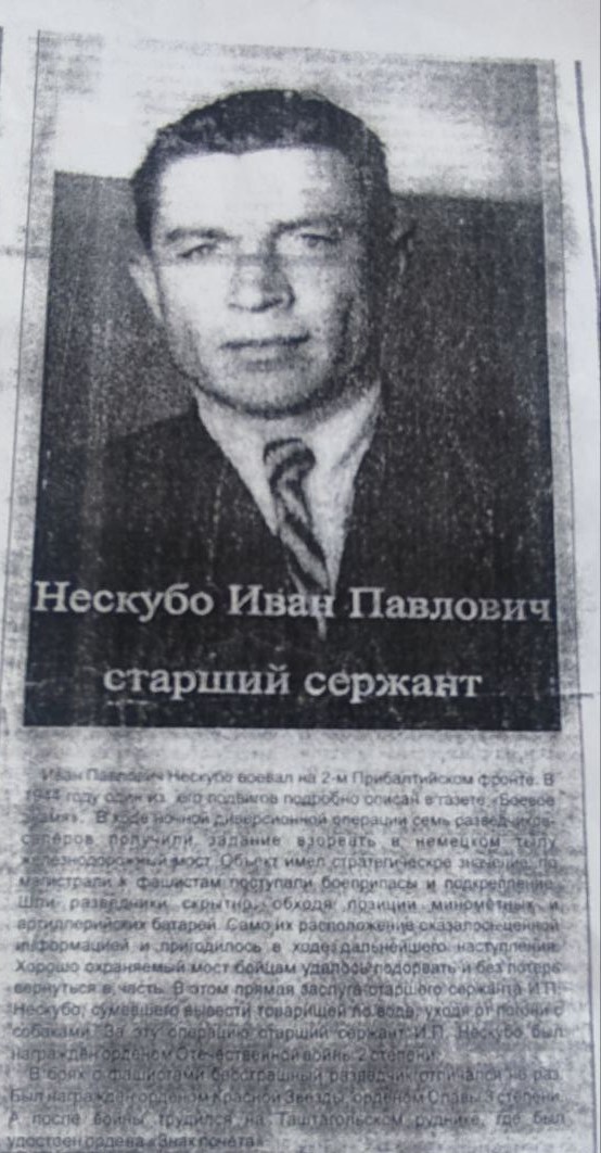 Иван Нескубо родился в 1921 году в селе Вознесенко Родинского района Алтайского края. На начало войны Ивану было 20 лет. На службу призван в Таштагольском Военкомате Кемеровской области в звании старшины. Награжден тремя орденами и медалью. Документы о награждении: фото награды, наградные листы.