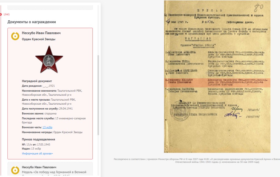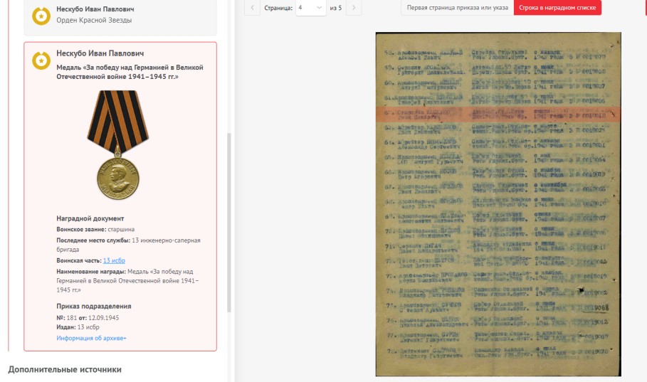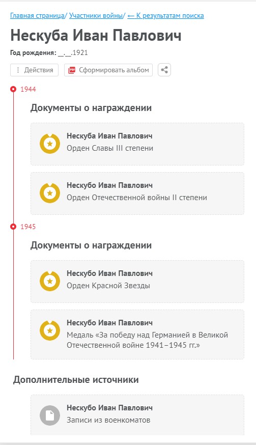 Я начал поиск с беседы с родными. К сожалению, прадеда и дедушки уже очень давно нет в живых. Связь с родственниками утеряна. Документов, фотографий нет. Продолжил поиск на портале «Память народа», в галерее «Дорога памяти». Фамилия упоминается в 5 документах, в одном из них под фамилией «Нескуба», в других «Нескубо». Сравнив сведения, (дату рождения, место рождения, место призыва в ряды Советской Армии) понял, речь идет об одном человеке (имеет место ошибка в документе). Смог изучить личную карточку, найти наградные документы, изучить боевой путь прадеда. В галерее «Дорога памяти» информации нет.
