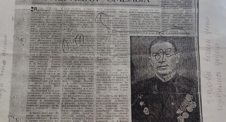 В этой же газете в декабре 1944 года появилась заметка «Прославленному разведчику, из подразделения капитана Демидова. Старший сержант И. П. Нескубо 1921 года рождения показал себя в боевых операциях смелым, уверенным и умелым воином...». Мама рассказала, что этот герой - мой прадед, отец маминого папа.