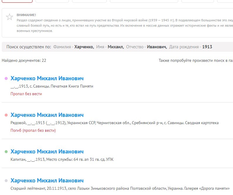 На портале «Память народа» я обнаружил четыре полных совпадения. Проанализировал данные: один пропал без вести, другой – погиб (пропал без вести), третий в звании капитан. По совокупности данных четвертый тёзка - мой прадед Харченко Михаил Иванович.