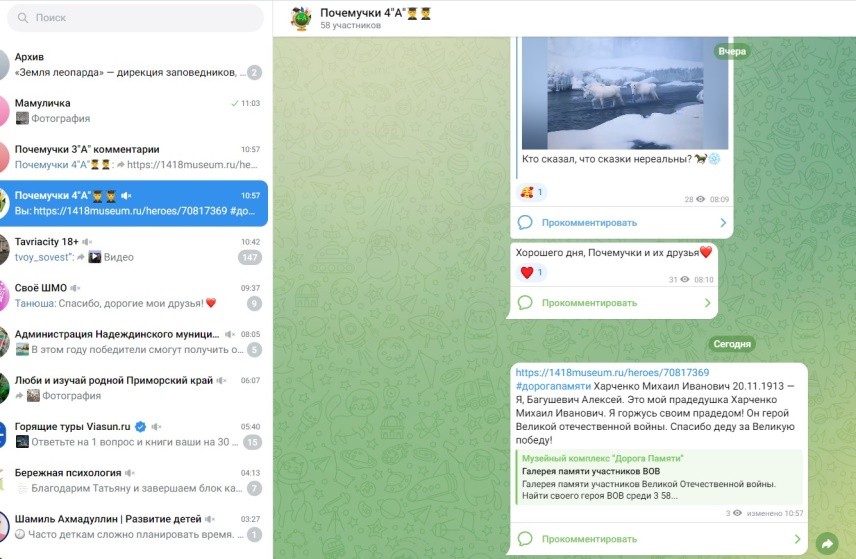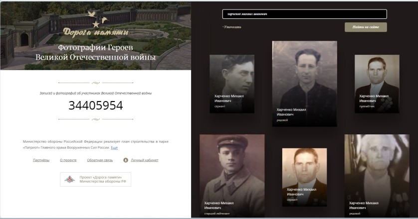 Посчитал важным поделиться своим исследованием. Опубликовал в группе класса в телеграмм - канале «Почемучки». В Москве в музейном комплексе «Дорога памяти. 1418 шагов к Победе» более 33 миллионов фотографий героев. Один из стендов посвящён моему прадеду - Харченко Михаилу Ивановичу.